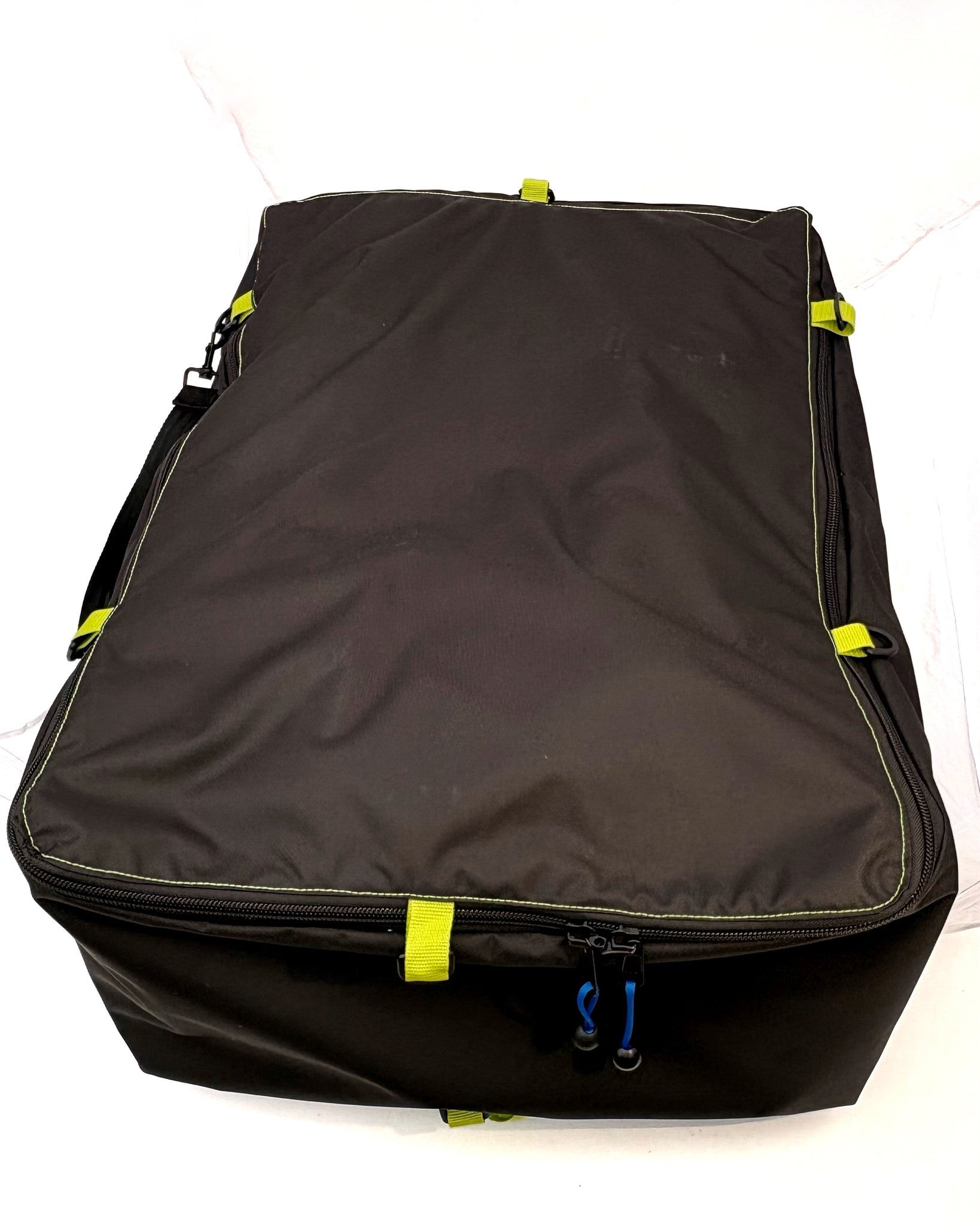 Tough, weatherproof black cordura nylon fabric with strong webbing and YKK zips with floro green stitching.